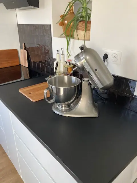 Le plan de travail noir mat aujourd'hui, après 4 années d'utilisation quotidienne